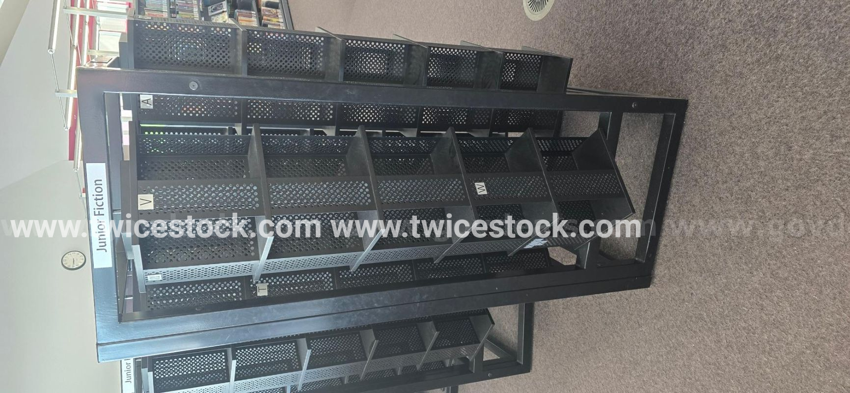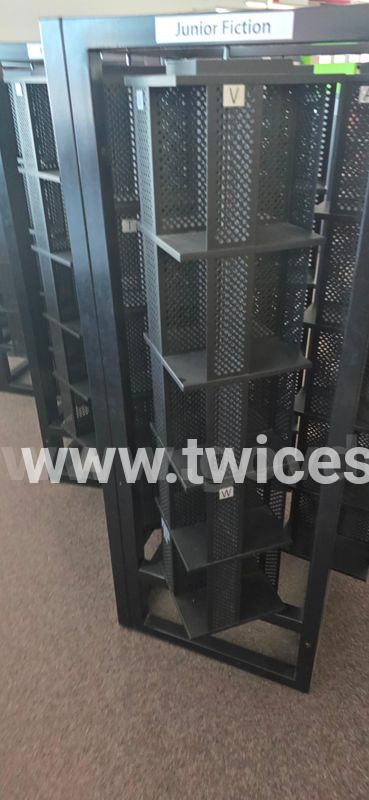 black all steel spinning book shelves. Approximately 5 feet tall and 16 inches square. Has 4 rotating shelves with 5 layers each. There are 4 of these units, as shown in the one picture, but they are being sold individually. They are in excellent shape. They do not come apart and are VERY HEAVY!!! Starting at $100 per unit. Located at the Waterloo Public Library inside the Stork Family YMCA at 500 Fischer-Hallman Drive in Waterloo (NOT AT 35 ALBERT STREET). Upon successful bid, please make arra