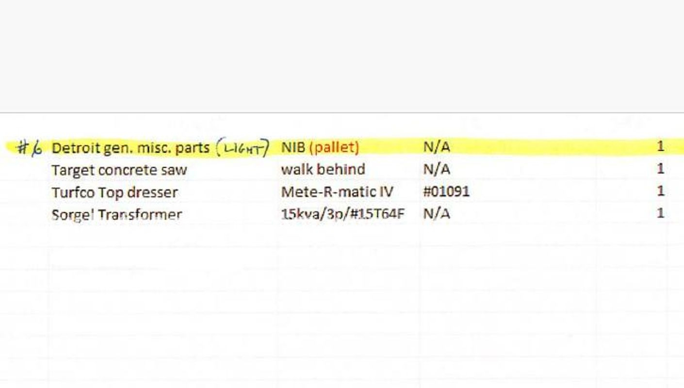 Gulfport Biloxi International Airport Authority Surplus Pallet #6 Includes but not limited to: Target Concrete Saw; Turfco Top Dresser; Sorgel Transformer; Detroit Gen. Misc. Parts (light).